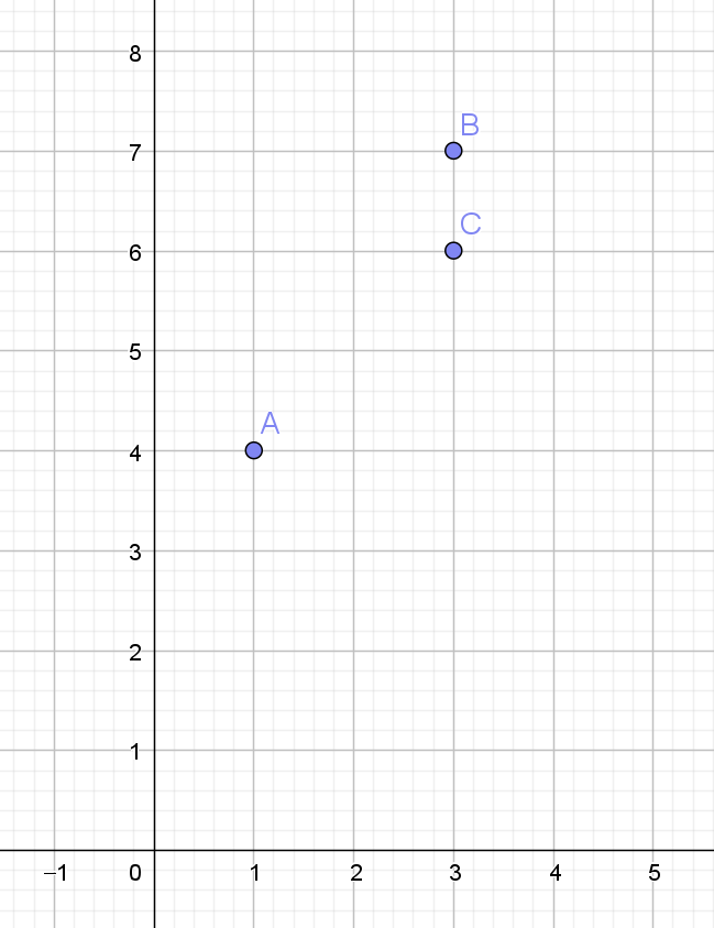 Den kaldes også skak-konge afstanden. Kongen i skak kan gå diagonalt eller langs de to akser. Et diagonalt move fra \((a,b)\) til \((a+k,b+k)\) tænkes at have længde \(k\) – som i skak. Skal man fra eksempelvis \(A(1,4)\) til \(B(3,7)\) kan skakkongen gå fra \(A(1,4)\) til \(C(3,6)\) – det stykke har længde \(2\) og derefter fra \(C(3,6)\) til \(B(3,7)\) langs \(y\)-aksen - et stykke på længde \(1\). Samlet afstand er \(3\), maksimum af \(|3-1|\) og \(|7-4|\). Idéen er illustreret i figur 1.