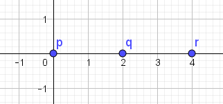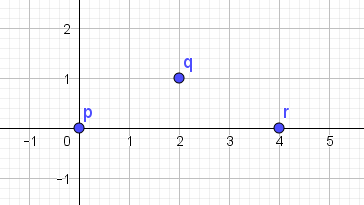 Et konkret eksempel: \(p=(0,0)\), \(q=(2,0)\), \(r=(4,0)\). Se figur 1.