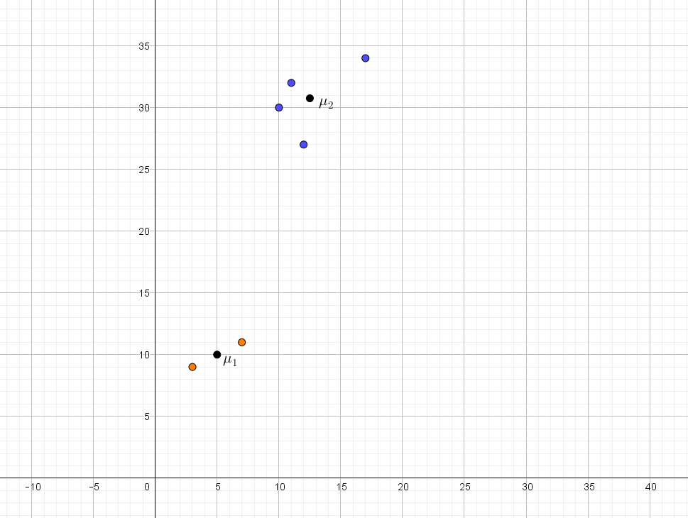 \[\vec{\mu_2}=\frac{1}{|S_2|}\sum_{\vec p\in S_2}\vec p = \frac{\begin{pmatrix} 10 \\ 30\end{pmatrix} + \begin{pmatrix} 17 \\ 34\end{pmatrix} + \begin{pmatrix} 12 \\ 27\end{pmatrix} + \begin{pmatrix} 11 \\ 32\end{pmatrix}}{4}= \frac{\begin{pmatrix} 50 \\ 123 \end{pmatrix} }{4} = \begin{pmatrix} 12.5 \\ 30.75 \end{pmatrix}\]
