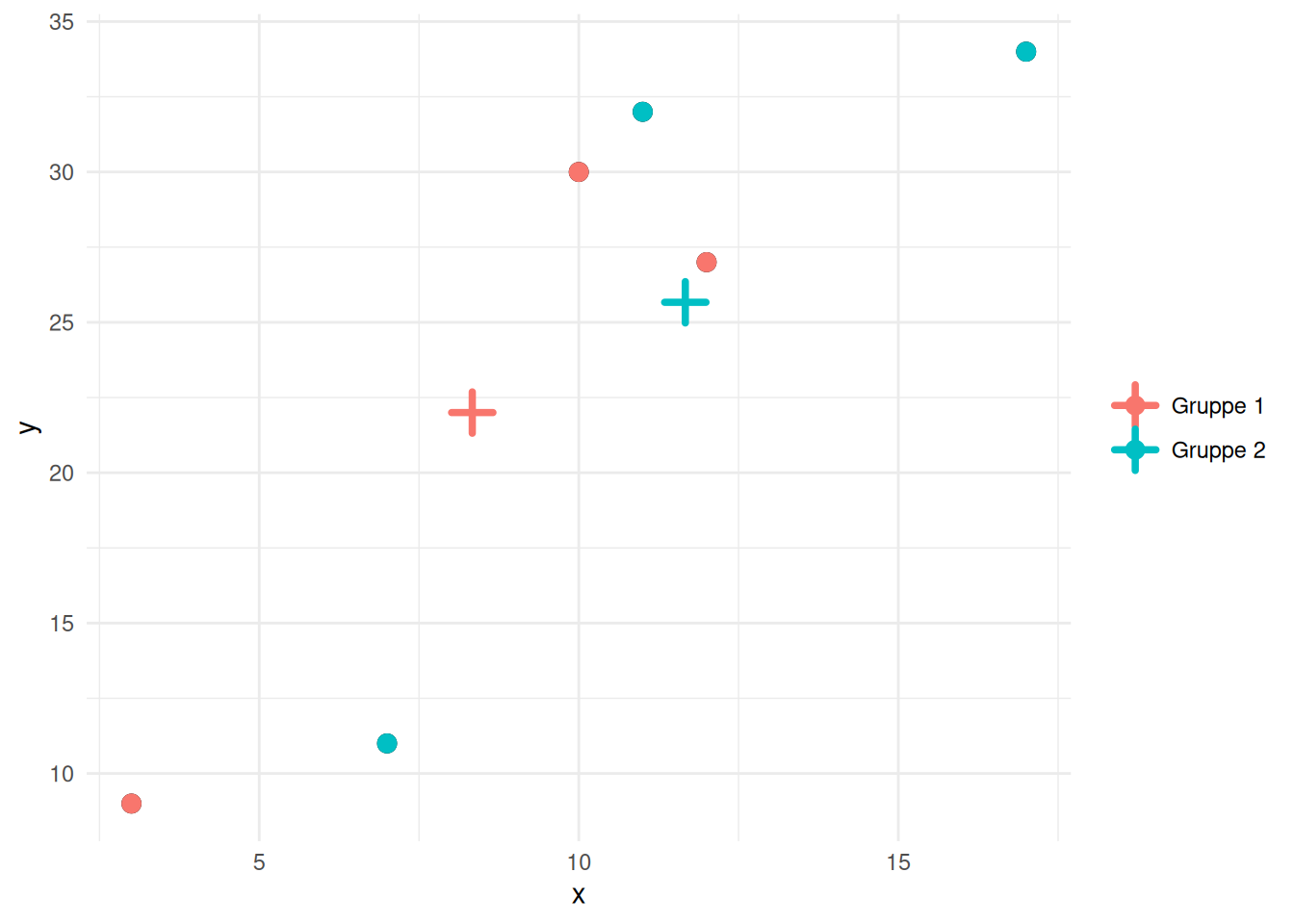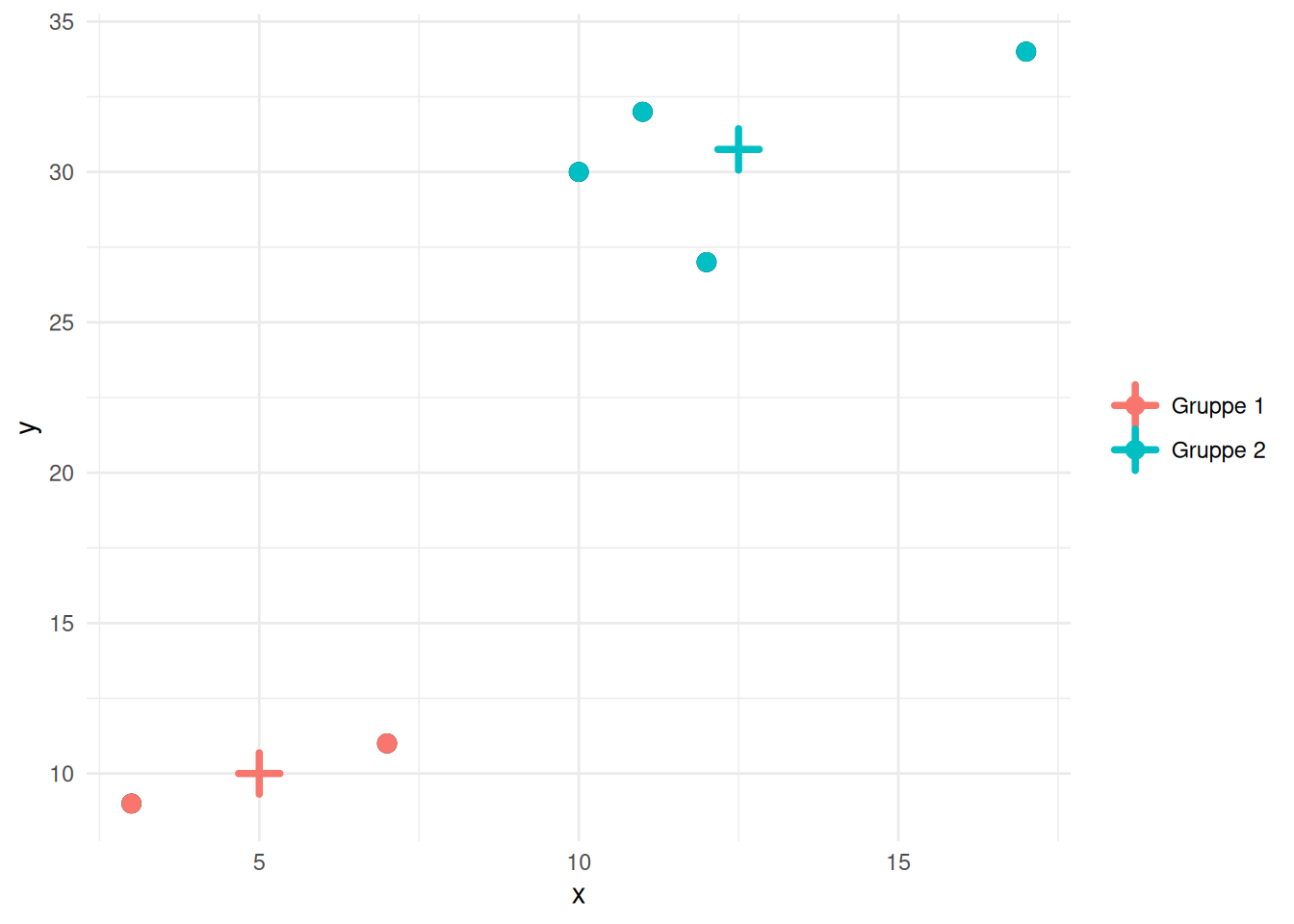 Midterpunktet for den anden gruppe har så koordinatsæt \((12.5, 30.75)\).
