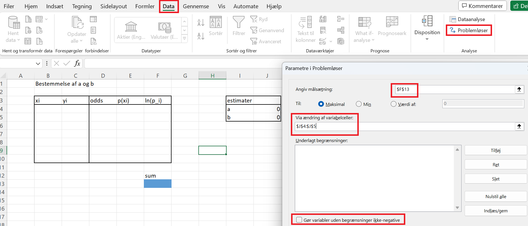 Nu mangler man bare at benytte problemløseren til at finde de værdier af \(a\) og \(b\), der gør værdien i det blå felt maksimal. På billedet er der vist med rød, hvor man finder problemløseren, og hvad der skal justeres. Målsætningen er den blå celle, der indeholder summen. Variabelcellerne er de to, der indeholder \(a\) og \(b\). Sørg for ikke at sætte flueben i boksen "Gør variabler uden begrænsninger ikke-negative". Tryk på løs.