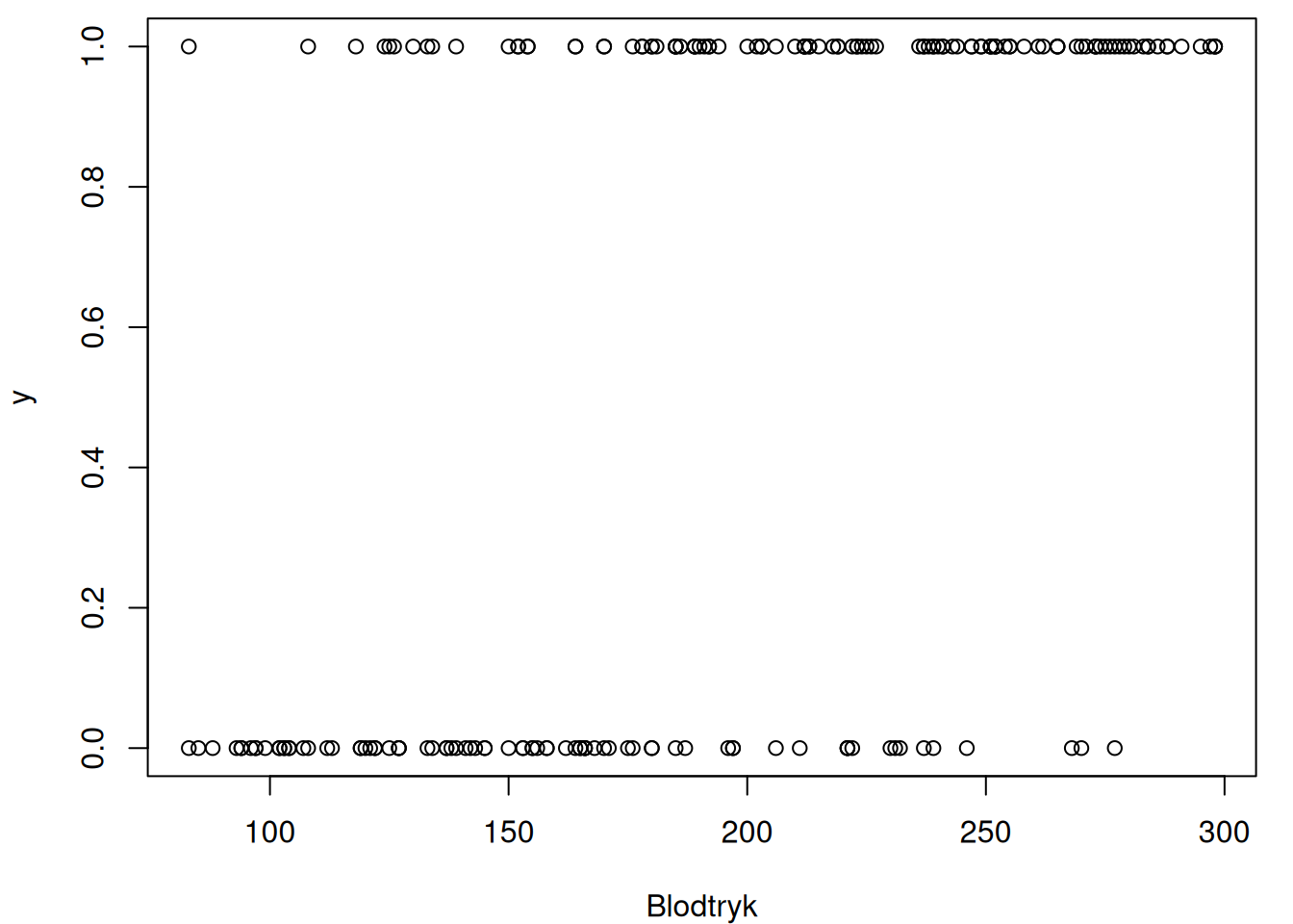 Det ses på figur 1, at der er flest personer med \(y\)-værdien 0, altså raske personer, blandt folk med lavt blodtryk, mens der er flest med \(y\)-værdien 1, svarende til syge, blandt folk med højt blodtryk. Ved de fleste blodtryksværdier er der dog både syge og raske, og det er svært at få et præcist overblik ud fra figuren.