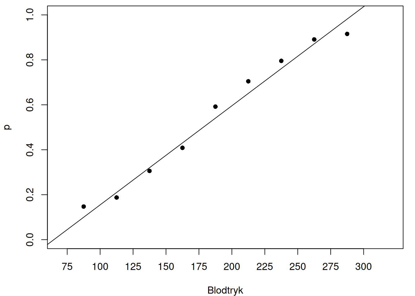 Der er et problem her: En sandsynlighed ligger altid mellem 0 og 1, men regressionslinjen ovenfor skærer \(x\)-aksen ved blodtryksværdier omkring 70. Det betyder, at sandsynligheden er negativ for blodtryk under 70. Tilsvarende får vi sandsynligheder, der er større end 1 ved blodtryk over 300. Det giver selvfølgelig ikke mening.