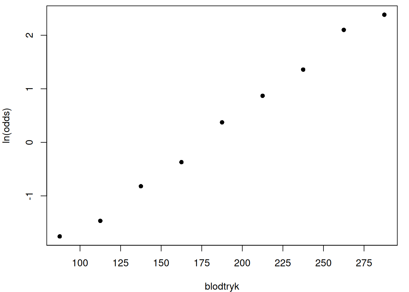 Vi ser, at oddsene for sygdom stiger med blodtrykket. Det betyder derfor også, at sandsynligheden for sygdom stiger med blodtrykket. Kigger vi på grafen, ser tendensen ikke lineær ud. Det kunne derimod ligne en eksponentiel vækst. For at bekræfte dette, laver vi samme plot på figur 7, men nu med den naturlige logaritme til oddsene \(\ln (O(p(x)))\) på \(y\)-aksen4.