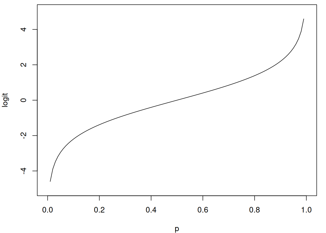 Når vi tager den naturlige logaritme til oddsene, får vi \[ \ln (O(p)) = \ln\left(\frac{p}{1-p}\right). \] Funktionen på højresiden kaldes \(\text{logit}\) og er altså givet ved \[ \text{logit}(p) = \ln\left(\frac{p}{1-p}\right). \] Definitionsmængden for \(\text{logit}\)-funktionen er ligesom for oddsene \(]0,1[\). Vi fandt tidligere, at værdimængden for oddsene består af alle de positive reelle tal. Dette er netop definitionsmængden for \(\ln\). Værdimængden for \(\text{logit}\) bliver derfor den samme som for \(\ln\), nemlig alle de reelle tal. Grafen for \(\text{logit}\) er vist på figur 8.