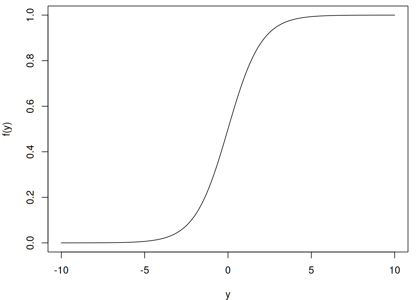 Sammenlagt har vi vist, at den inverse funktion til logit er den standard logistiske funktion (også nogle gange kaldet sigmoid-funktionen) \[ f(y) = \frac{1}{1+\mathrm{e}^{-y}}. \] Grafen for den standard logistiske funktion er indtegnet i figur 9. Vi ser, at grafen har en karakteristisk S-form, som vokser fra \(0\) mod \(1\).