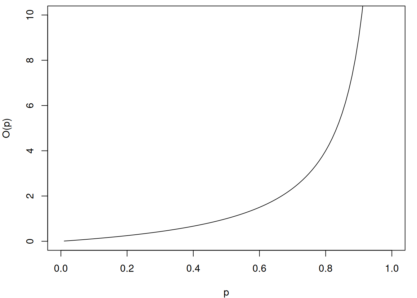 Læg her mærke til at jo større \(p\) bliver, desto større bliver odds \(O\) også.