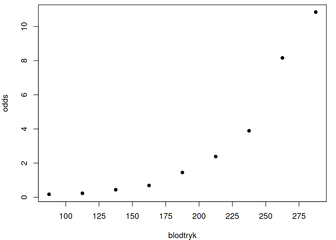 I vores dataeksempel, hvor sandsynligheden for hjerte-kar-sygdom er en funktion \(p(x)\), bliver oddsene for hjerte-kar-sygdom også en funktion af \(x\) \[ O(p(x)) = \frac{p(x)}{1-p(x)}, \] hvor \(x\) er blodtrykket.