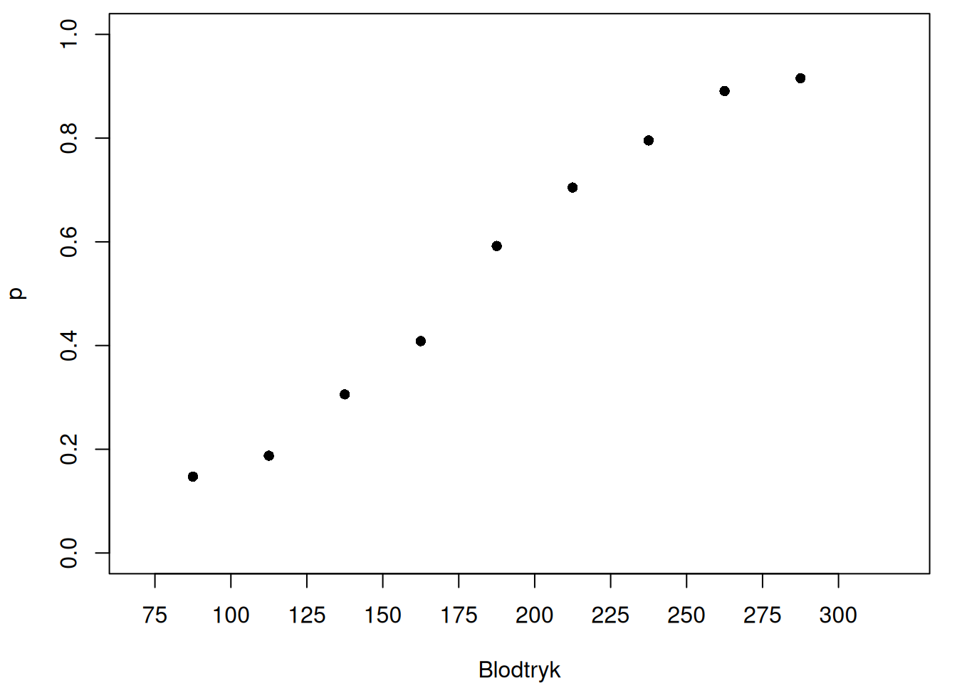Grafen for \(p\) er vist på figur 4. Vi får en odds-ratio på \(\mathrm{e}^{0.022} \approx 1.022\). Odds for hjerte-kar-sygdom stiger derfor med en faktor 1.022 (altså 2.2%), for hver gang blodtrykket stiger med \(1\) mmHg.