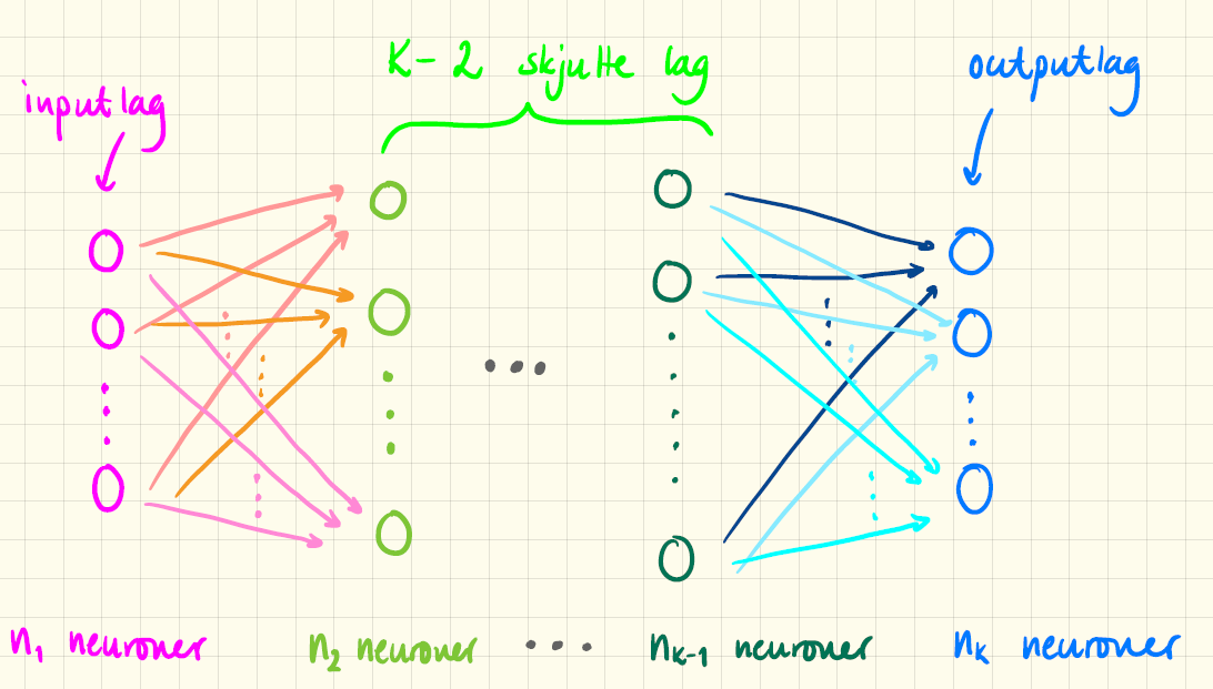 Vi forestiller os nu, at vi har \(K\) lag i netværket, som det er illustreret på figur 4.