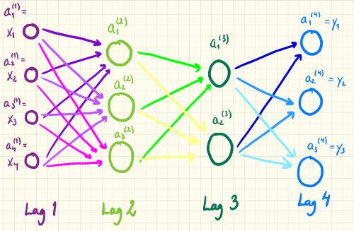 Hvert lag i netværket er nu nummeret fortløbende fra \(1\) til \(4\). Desuden giver vi nu en samlet betegnelse for den værdi, som hver neuron "spytter ud". F.eks. vil den \(3.\) neuron i det \(2.\) lag "outputte" eller "fyre" værdien \[ a_3^{(2)} \] Det vil altså sige, at det tal, som står hævet i parentesen1, refererer til laget og det tal, som er sænket, refererer til nummeret på rækken i det givne lag.