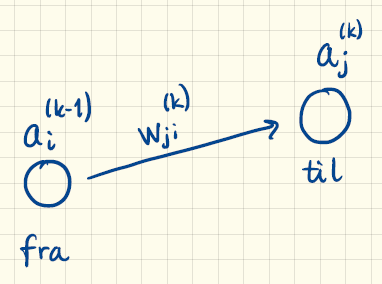 Her er tanken, at vi gerne vil beregne outputværdien fra den \(j\)’te neuron i det \(k\)’te lag. Det gør vi ved at vægte alle outputværdierne fra det foregående lag: (\(k-1\)). Den vægt, som vi ganger outputværdien fra den \(i\)’te neuron i det \((k-1)'te\) lag (\(a_i^{(k-1)}\)) med, og som skal bruges for at beregne \(a_j^{(k)}\), vælger vi at kalde for \[ w_{ji}^{(k)} \] Hvis man tænker på, at vi skal til række \(j\) i lag \(k\) fra række \(i\), så kan man måske huske på notationen sådan her: \[ w_{\textrm{til fra}}^{(\textrm{lag})} \] Se også hvordan det passer med figur 2.