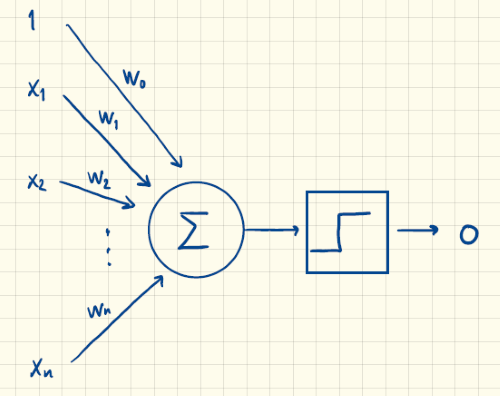 Her illustrerer sumtegnet i cirklen, at vi tager en vægtet sum af alle inputværdierne (inklusiv et input (\(x_0\)), som altid er \(1\), og som vægtes med \(w_0\) svarende til, at vi får vores bias med), mens grafen af trappefunktionen i firkanten viser, at vi diskretiserer denne vægtede sum, sådan at outputværdien enten er \(-1\) eller \(1\).