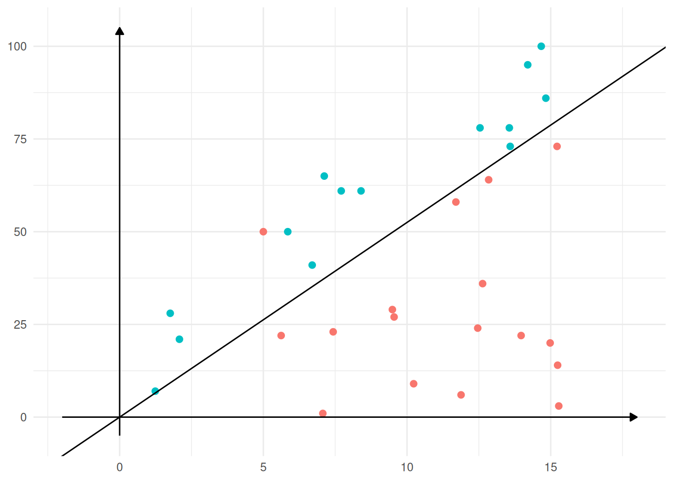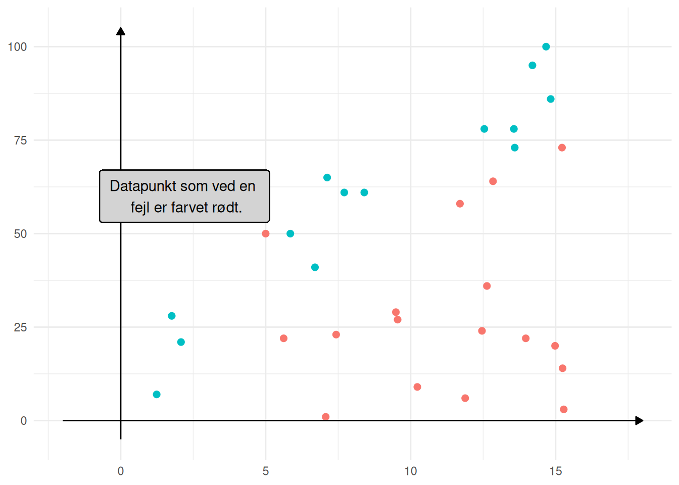 Verden er sjældent lineær separabel! Antag, at der ingen fejl er i datasættet i figur figur 7. Alligevel vil det stadig give mening at indtegne en ret linje som i figur figur 8, der kan bruges til klassificering. Med en enkelt undtagelse vil man klassificere alle træningsdata korrekt ved hjælp af denne linje.
