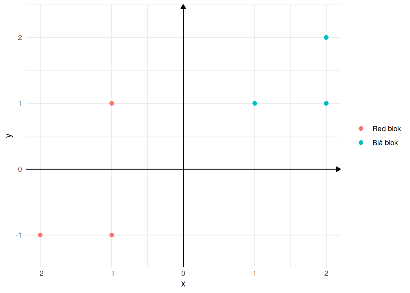 Og sådan kunne man opstille andre eksempler: \[ \begin{aligned} &(x_1,x_2)=(-1,1) \quad \Rightarrow \quad t=-1 \\ &(x_1,x_2)=(-1,-1) \quad \Rightarrow \quad t=-1 \\ &(x_1,x_2)=(1,1) \quad \Rightarrow \quad t=1 \\ &(x_1,x_2)=(2,2) \quad \Rightarrow \quad t=1 \\ &(x_1,x_2)=(-2,-1) \quad \Rightarrow \quad t=-1 \\ \end{aligned} \] Det første eksempel siger for eksempel, at en person har været overvejende uenig i at sætte indkomstskatten ned (\(x_1=-1\)), overvejende enig i at danske virksomheder ikke skal pålægges en CO2-afgift (\(x_2=1\)) og samtidig vil denne person stemme på rød blok (\(t=-1\)).