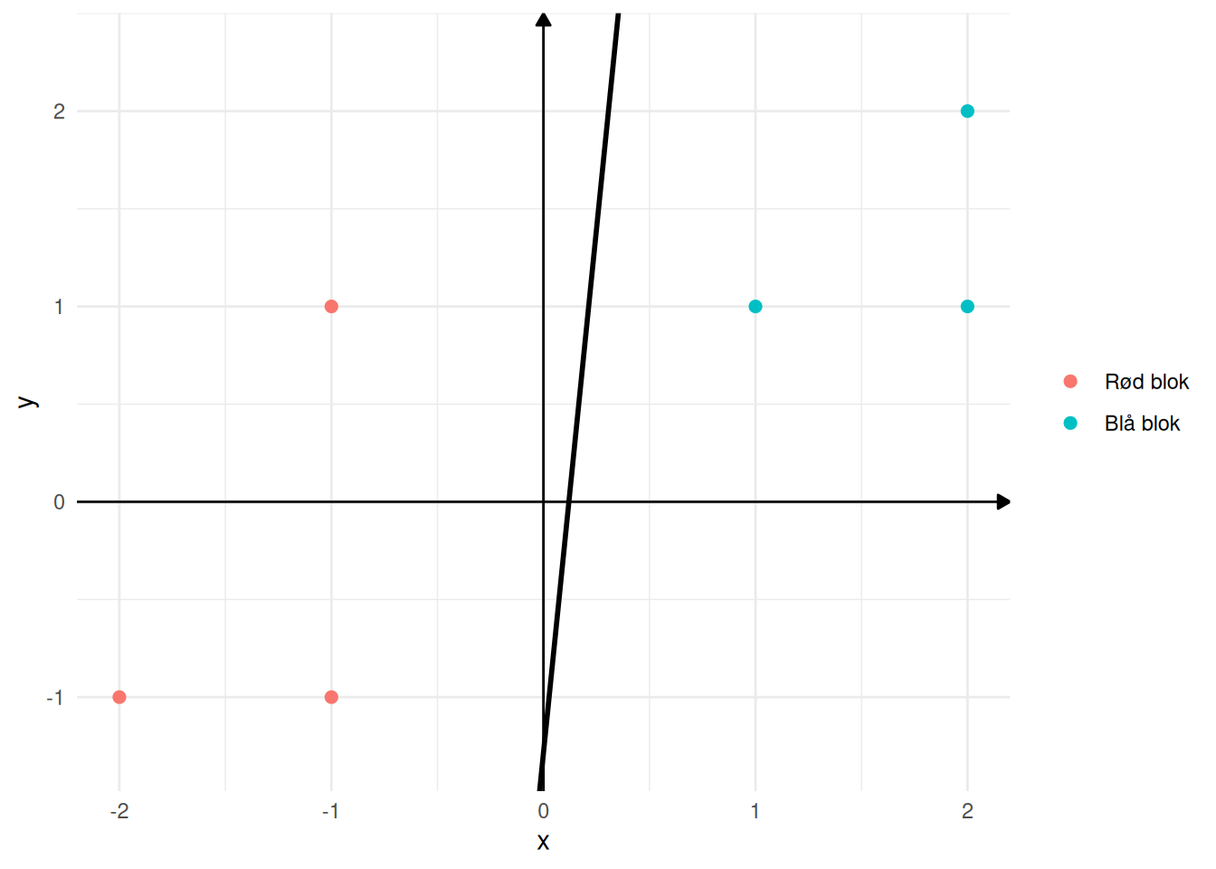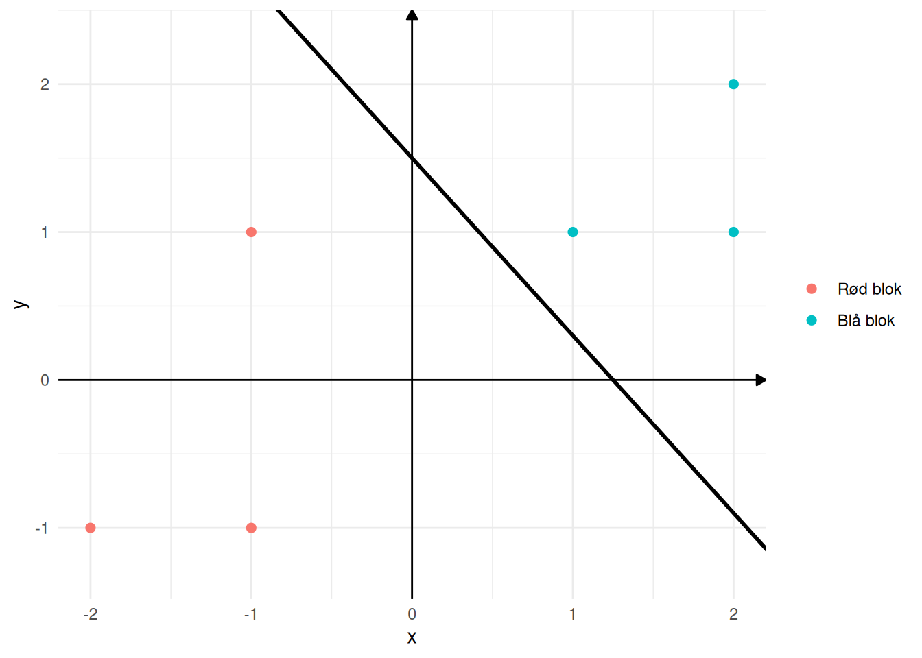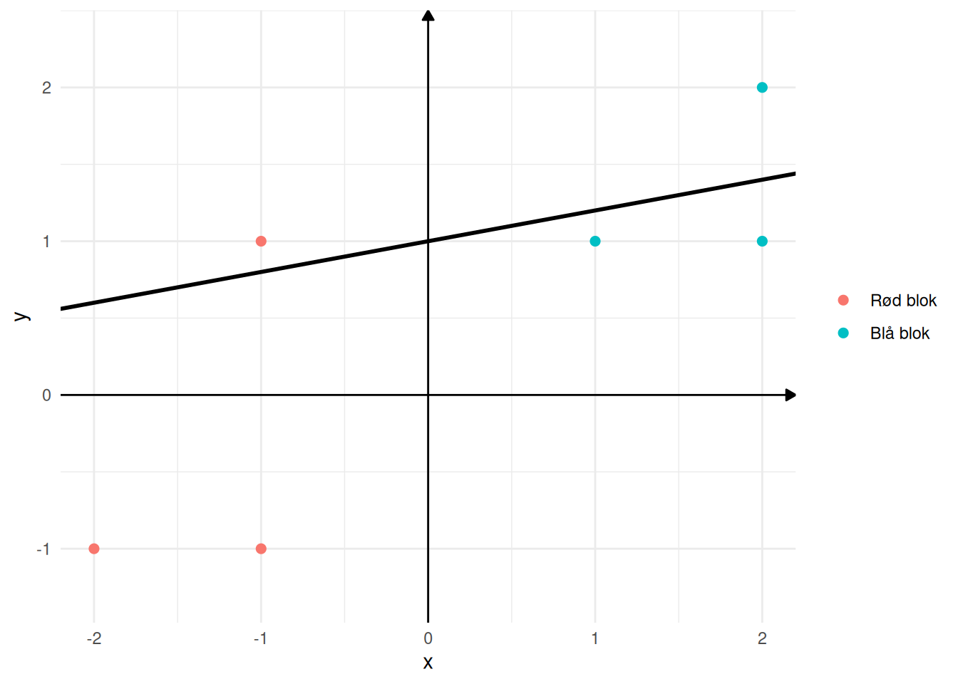 Man siger også, at man på baggrund af inputværdierne kan lave en klassificering (eller kategorisering). Det betyder, at vi på baggrund af inputværdierne kan beregne, om vi er i kategorien "Blå blok" (\(o=1\)) eller i kategorien "Rød blok" (\(o=-1\)). Grafisk svarer det til, at man indtegner sit \((x_1, x_2)\)-punkt i koordinatsystemet i figur 3 og ser så på om punkt ligger over eller under linjen (ligger det over skal vi stemme blå blok).