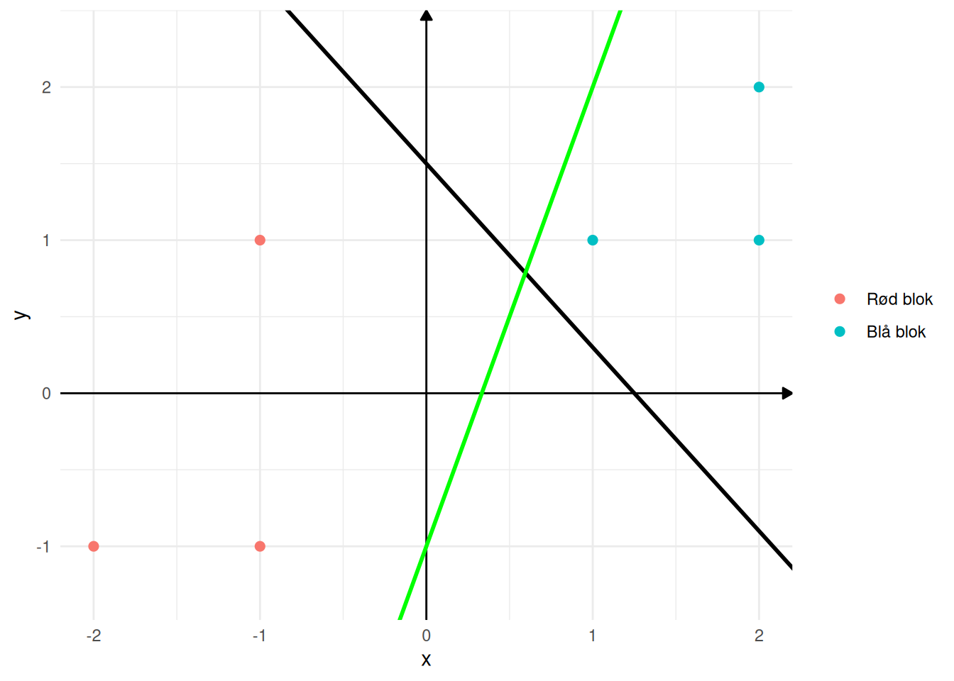Sådan fortsætter man nu med træningseksempel nr. \(4, 5\) og \(6\), og så starter man forfra igen med træningseksempel nr. \(1\), \(2\) og så videre. Når man har været igennem en hel runde af de \(6\) træningseksempler, hvor vægtene ikke har ændret sig, så stopper man! I vores lille eksempel kommer der faktisk ikke flere opdateringer af vægtene, og man ender derfor med følgende vægte: \[ \begin{aligned} w_0 = -0.5, w_1 = 1.5, w_2=-0.5 \end{aligned} \] Det svarer til ligningen \[ \begin{aligned} -0.5 +1.5 \cdot x_1 -0.5 \cdot x_2 = 0. \end{aligned} \] Indtegner man linjen med denne ligning i et koordinatsystem sammen med vores træningsdata, og den linje vi selv “sjussede” os frem til, så kommer det til at se sådan her ud (den grønne linje er den, som kommer fra perception learning algoritmen):