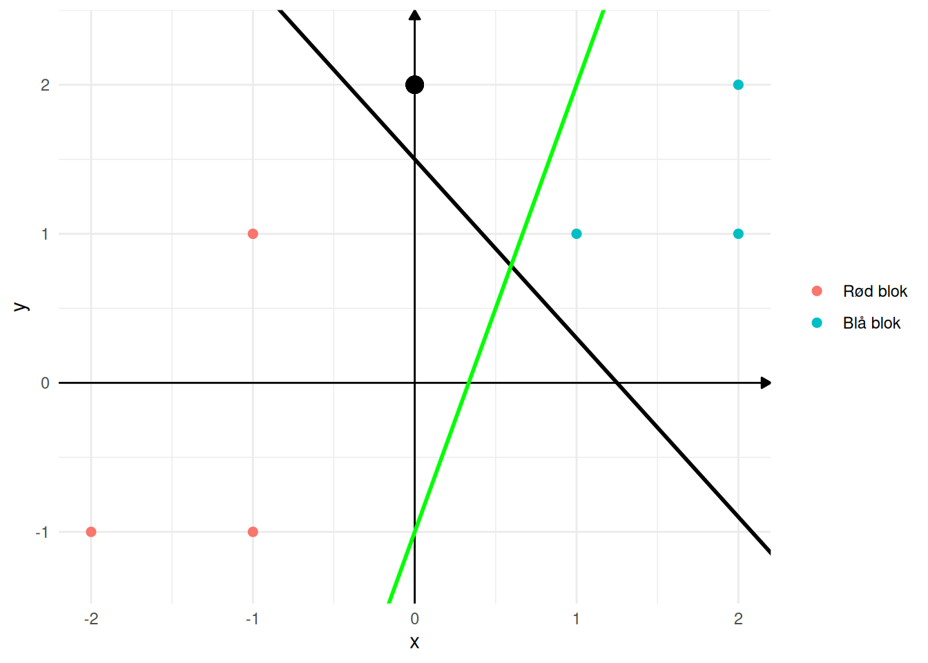 Det sorte punkt i \((0,2)\) repræsenterer vælgerens svar på de to spørgsmål. Her kan vi se, at punktet ligger over den sorte linje svarende til, at vi med denne klassificering anbefaler vælgeren at stemme på blå blok. Samtidig ligger punktet til venstre for den grønne linje og bruges denne linje til klassificering, vil vi nu anbefale vælgeren at stemme på rød blok.