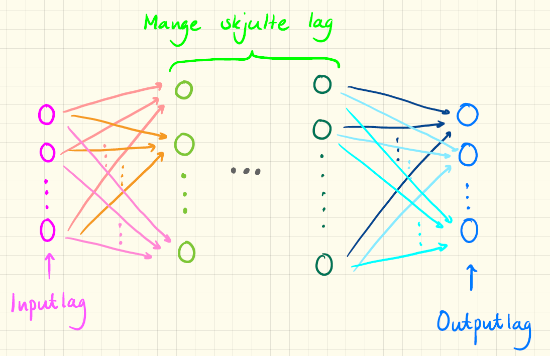 Et generelt kunstigt neuralt netværk består af en masse neuroner, som er sat sammen i en række lag. Det kunne for eksempel se ud som i figur 1, hvor de grønne neuroner i midten repræsenterer de såkaldte skjulte lag.