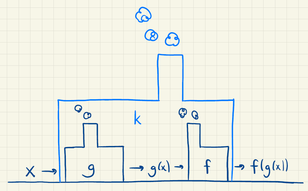 For at beregne \(k(x)\) "sender" vi først \(x\) ind i "funktionsmaskinen" for \(g\). Her bliver \(g(x)\) beregnet. Denne værdi "sendes" så ind i "funktionsmaskinen" for \(f\) og dermed bliver \(f(g(x))\) beregnet, som netop er \(k(x)\).