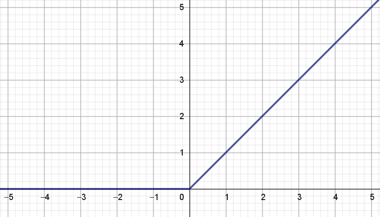 \[ \textrm{ReLu}(x) = \begin{cases} 0 & \textrm {hvis } x \leq 0 \\ x & \textrm {hvis } x > 0 \end{cases} \]