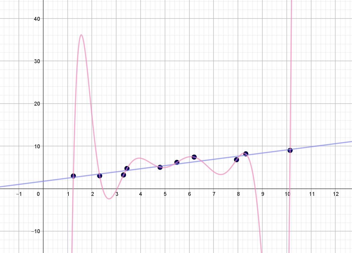 Når en models anvendelighed vurderes ved hjælp af mål som RMSE og \(R^2\)-værdi, så vil det altid være sådan, at jo mere kompliceret en model, man bruger, desto bedre mål vil man få (det vil sige en lille værdi af RMSE og en værdi af \(R^2\), som er tæt på \(1\)). Hvorfor det er tilfældet, kan du læse meget mere om i noten Overfitting, modeludvælgelse og krydsvalidering). Men kort fortalt går det ud på, at en meget kompliceret model kan fange tendenser i data, som i virkeligheden ikke er reelle – det er bare støj. Et eksempel ses i figur 2. Her er ti punkter indtegnet, hvor der er anvendt lineær regression (den lyseblå linje) og 9. grads polynomiel regression (den lyserøde kurve).