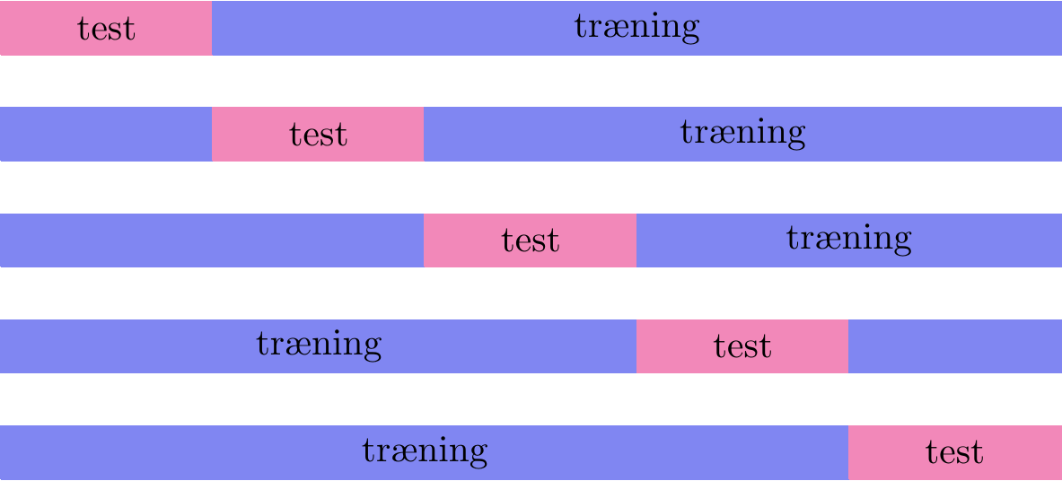 Her stammer inputværdierne \(x_1^{(m)}, x_2^{(m)}, \dots, x_n^{(m)}\) fra del 1, men vægtene \(w_0, w_1, w_2, \dots, w_n\) er fundet ved at bruge data fra del 2, 3, 4 og 5. Man undersøger altså, hvor god modellen er til at prædiktere data i del 1, hvis den kun er trænet på data fra del 2, 3, 4 og 5. Derfor kalder man del 1 for testdata og del 2, 3, 4 og 5 for træningsdata. Det er helt essentielt her, at man tester sin model på en del af data, som ikke har været brugt til at træne modellen på. Dette gentager man så, men næste gang er det del 2, som er testdata, og del 1, 3, 4 og 5, som er træningsdata. Igen udregnes RMSE. Denne proceduren gentages i alt 5 gang. Det giver 5 forskellige RMSE værdier. Herefter tager man gennemsnittet af dem for at få et samlet mål for modellens anvendelighed.
