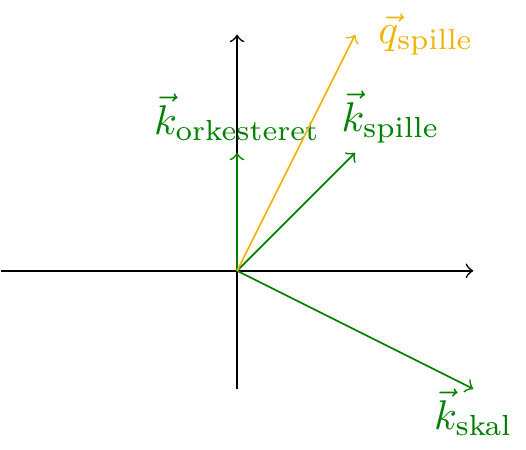 På figur 7 er vektorerne \(\vec{v}_{\text{orkesteret}}\), \(\vec{v}_{\text{skal}}\), \(\vec{v}_{\text{spille}}\) og \(\vec{w}_{\text{spille}}\) indtegnet i et koordinatsystem. Det ses, at \(\vec{w}_{\text{spille}}\) er blevet trukket i retning af \(\vec{v}_{\text{orkesteret}}\) i forhold til \(\vec{v}_{\text{spille}}\).