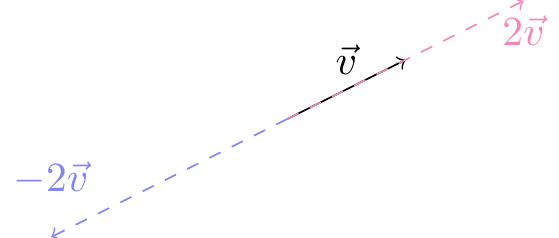 Hvis \(c>0\), er \(c\vec{a}\) en vektor, der peger i samme retning som \(\vec{a}\), men er \(c\) gange så lang. Hvis \(c<0\), er vektoren \(|c|\) gange så lang som \(\vec{a}\), men peger i modsat retning.