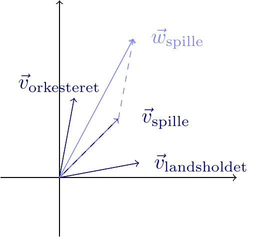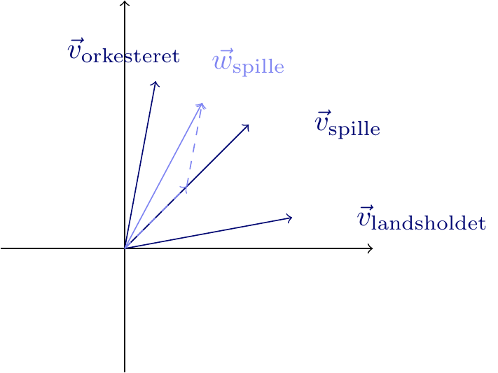 Det er illustreret på figur 2. Det ses, at retningen på \(\vec{w}_{\text{spille}}\) er blevet trukket over mod \(\vec{v}_{\text{orkesteret}}\) og væk fra \(\vec{v}_{\text{landsholdet}}\).