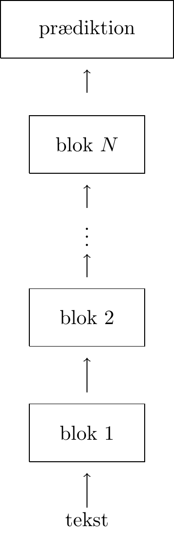 Når vi så har beregnet outputvektorerne \(\vec{y}_i\) fra en transformerblok for alle positioner \(i\), kan vi bruge dem som input til en ny transformerblok. I hvert opmærksomhedslag inden for den næste transformerblok oversættes vektoren \(\vec{y}_i\) (ikke det oprindelige ord) til tre nye vektorer. Så beregner transformerblokken en ny \(\vec{y}_i\), som kan bruges som input til endnu en transformerblok og så videre. Tilsammen udgør disse transformerblokke et transformernetværk, som er skitseret på figur 9.