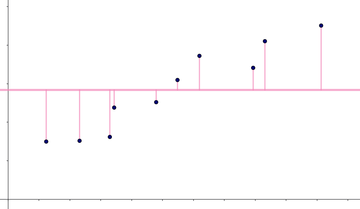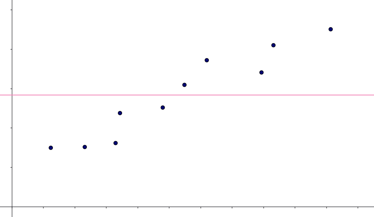 Et helt naivt bud på sammenhængen mellem \(x\) og \(y\) kunne være, at der ikke er nogen sammenhæng! Den naive model vil derfor være, at vores bedste bud på en \(y\)-værdi bare er gennemsnittet af alle \(y\)-værdierne: