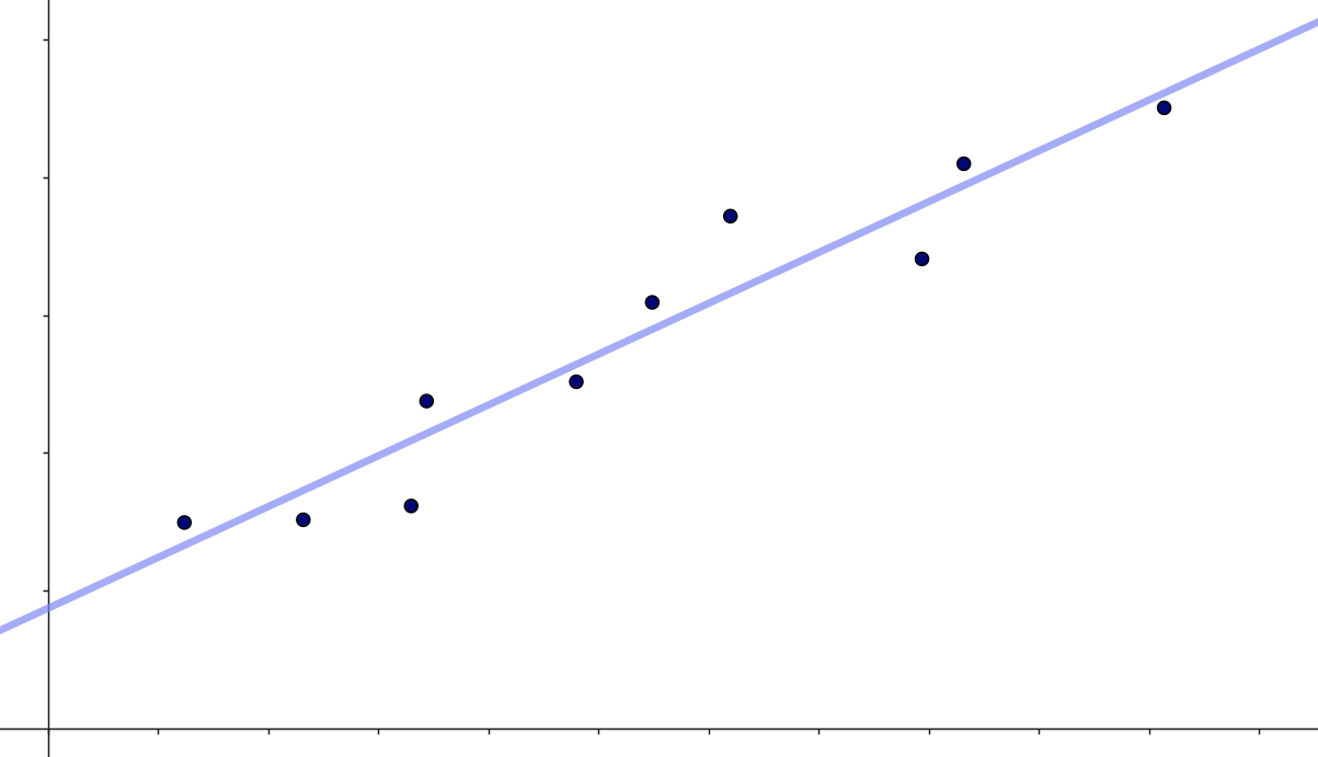 Hvis vi her skal komme med et bud på en \(y\)-værdi ud fra en given \(x\)-værdi, så vil vi indsætte vores \(x\)-værdi i \(y=a \cdot x +b\) og beregne \(y\)-værdien. Det vil sige, hvis vi for den målte værdi \(x_i\) skal komme med et bud på en tilhørende \(y\)-værdi (som man nogle gange kalder for \(\hat y_i\)), så vil det være: