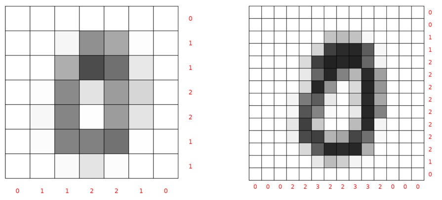 På figur 10 ses et billede af et håndskrevet 0 og 3-tal i en opløsning på \(7 \times 7\) pixels, og vi skal prøve at finde nogle karakteristika ved de to billeder, som kan bruges til at adskille dem.