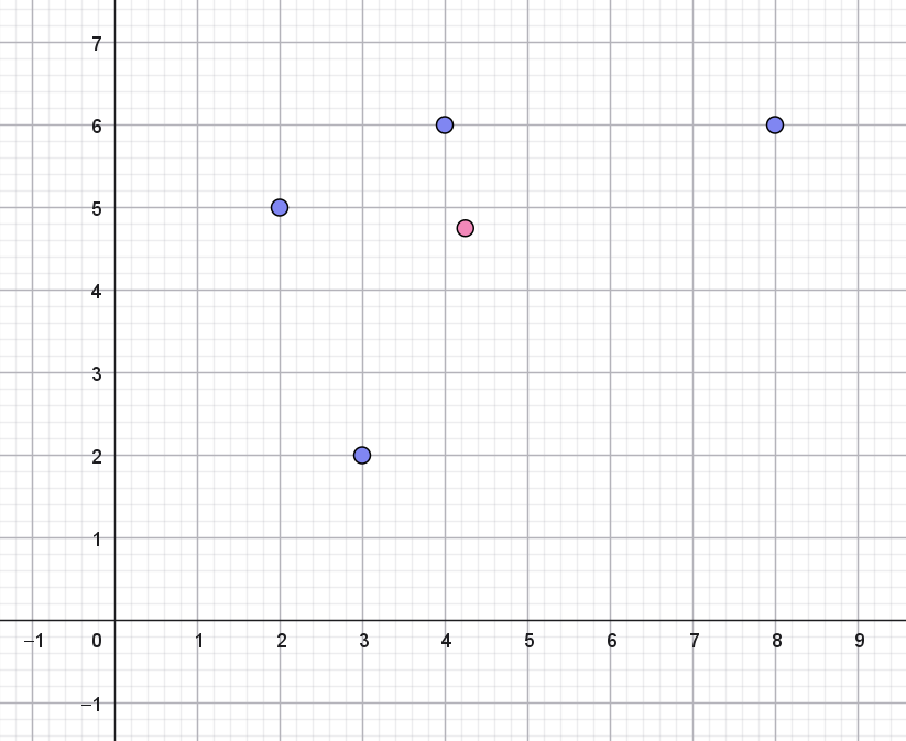 \[ (3,2) \qquad (8,6) \qquad (4,6) \qquad (2,5) \] så kan vi beregne denne gruppes midterpunkt ved at tage gennemsnittet af alle \(1.\) koordinaterne samt gennemsnittet af alle \(2.\) koordinaterne. Dette vil give koordinatsættet til midterpunktet: