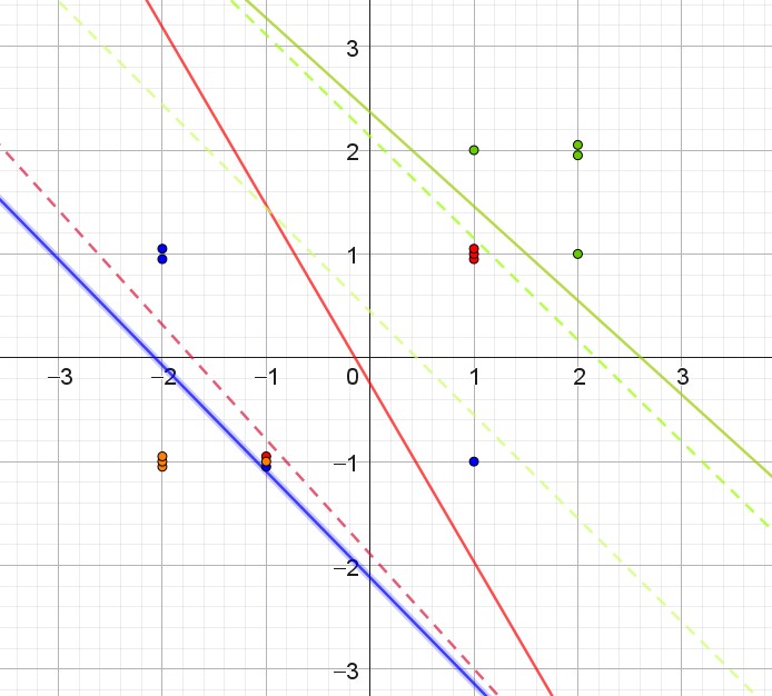 De tre øvrige linjer er mellem partier, som godt nok er lige sandsynlige, men hvor et tredje parti er mere sandsynligt. Disse linjer er tegnet stiplede.