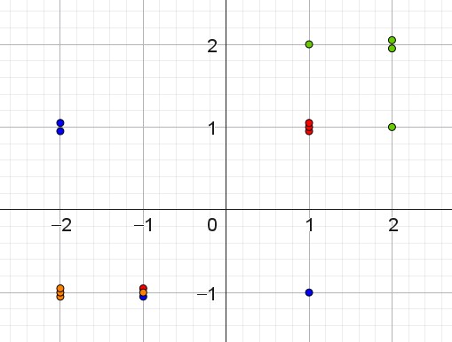 En mulig løsning er, at "flytte" nogle af punkterne meget lidt, hvor de ligger oveni hinanden. For eksempel kan man ændre \(1\) til \(1.05\). Så bliver punkterne synlige, men ligger stadig næsten samme sted.